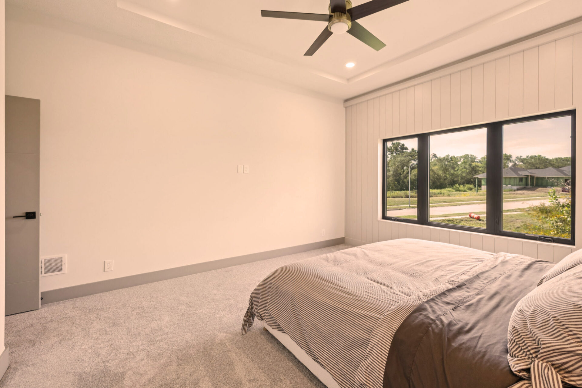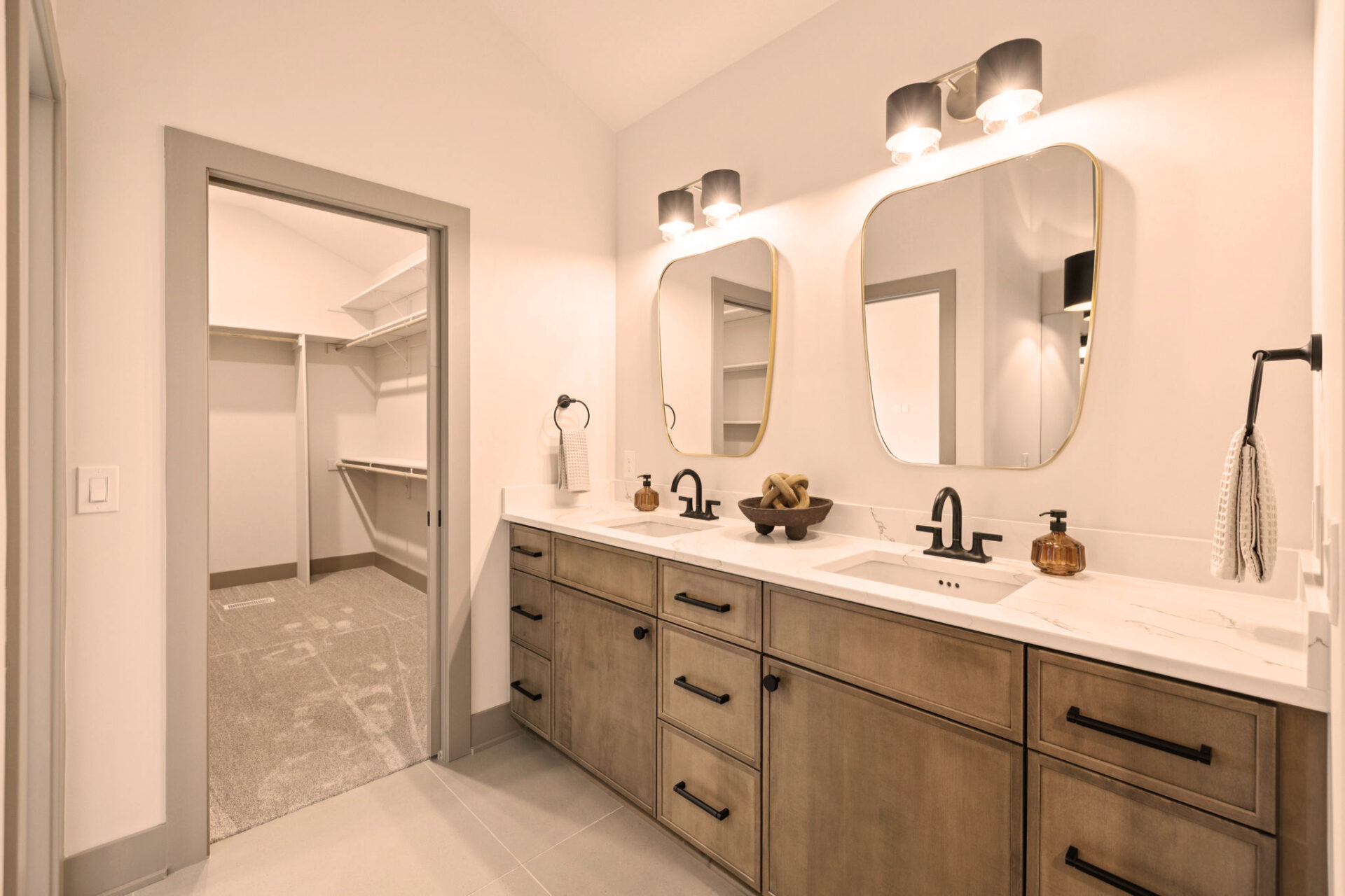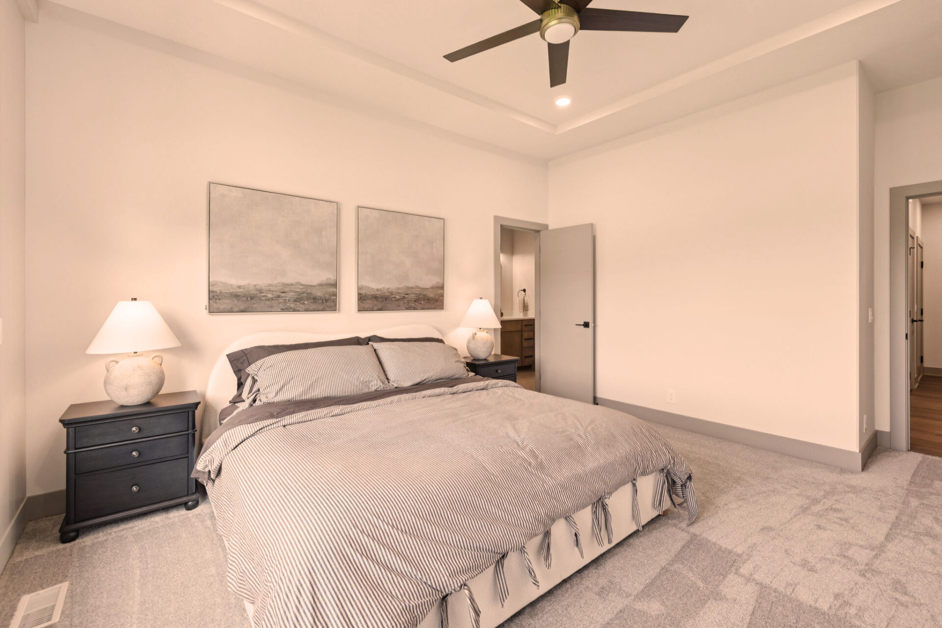 The Primary Suite is a sanctuary of privacy, thoughtfully positioned away from the other two main floor bedrooms. This design ensures a peaceful retreat, with the added convenience of an attached laundry room for seamless living.