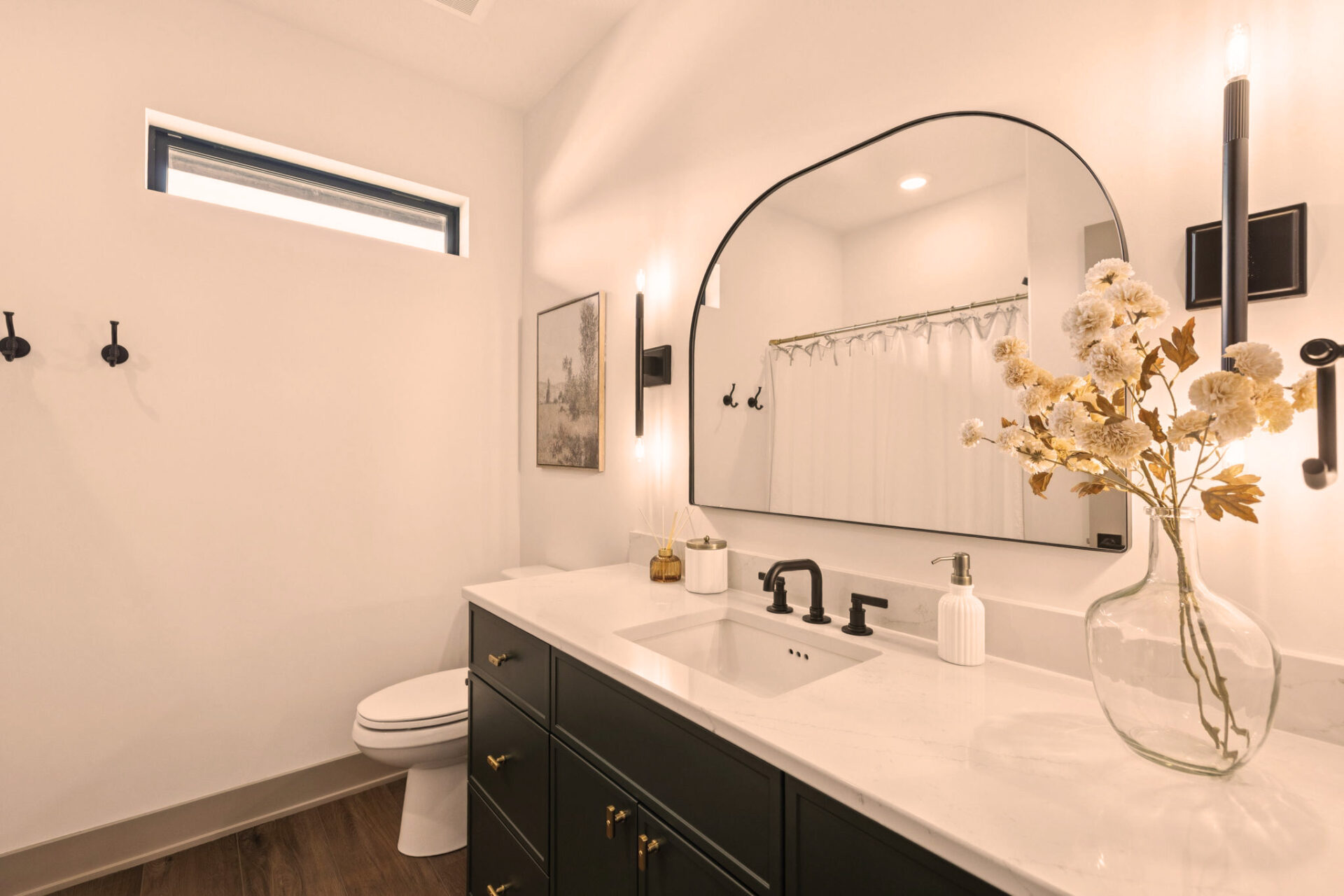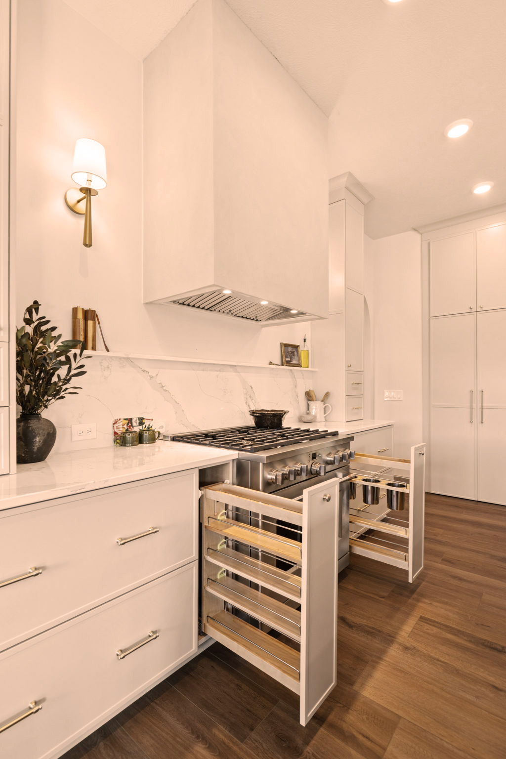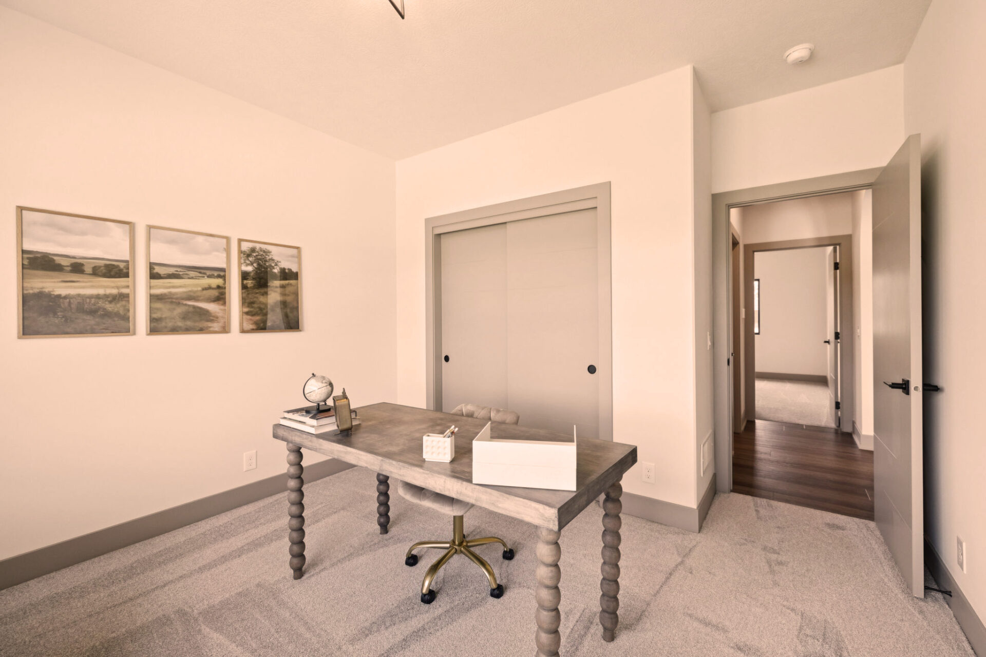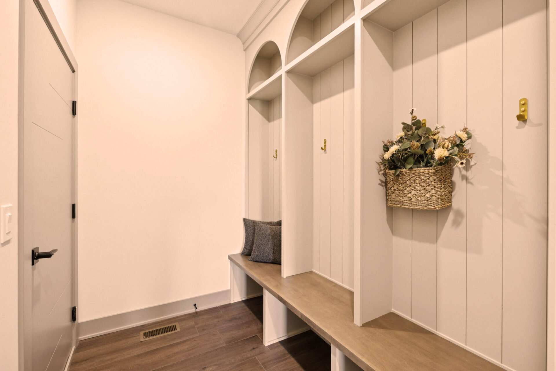 The Primary Suite is a sanctuary of privacy, thoughtfully positioned away from the other two main floor bedrooms. This design ensures a peaceful retreat, with the added convenience of an attached laundry room for seamless living.