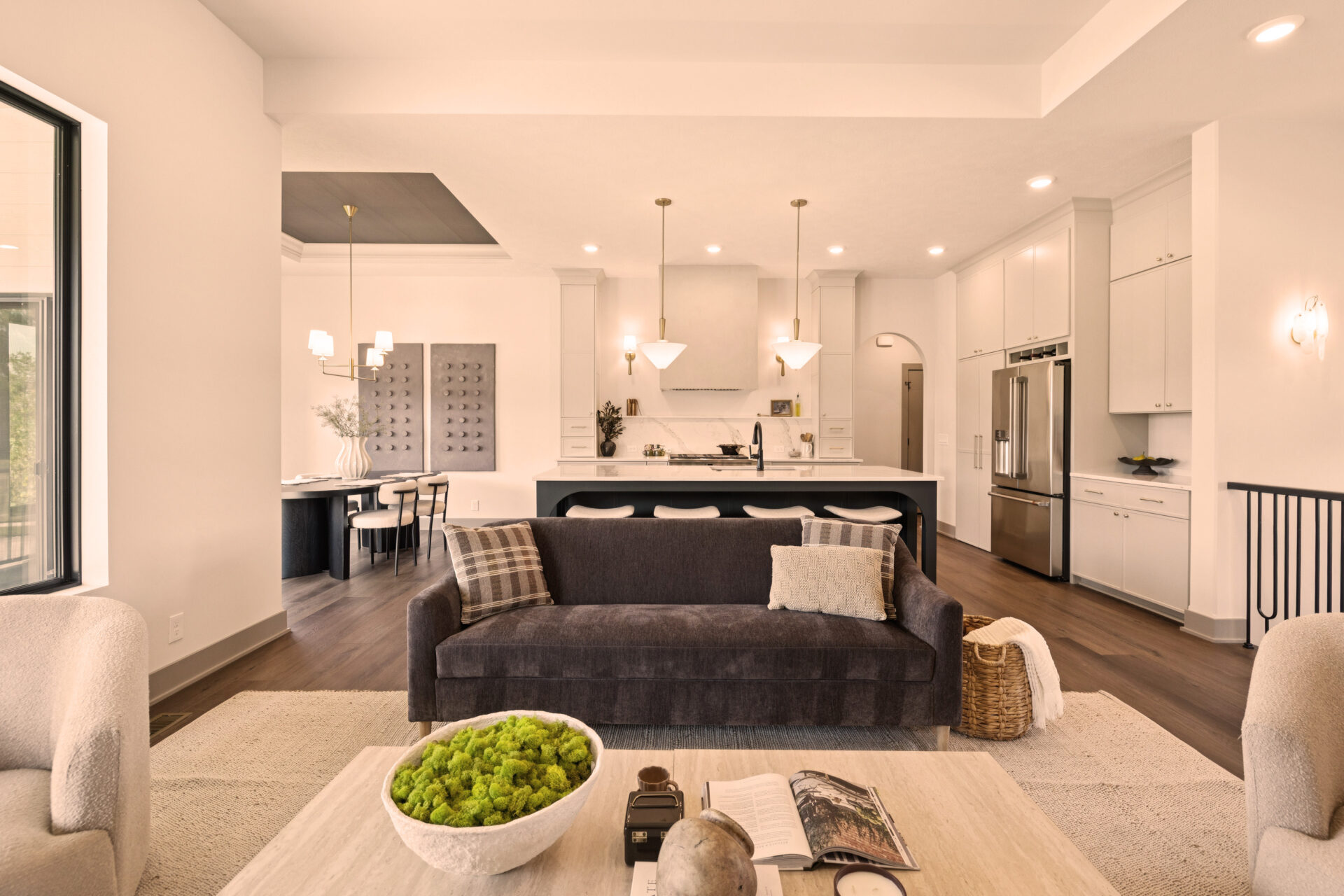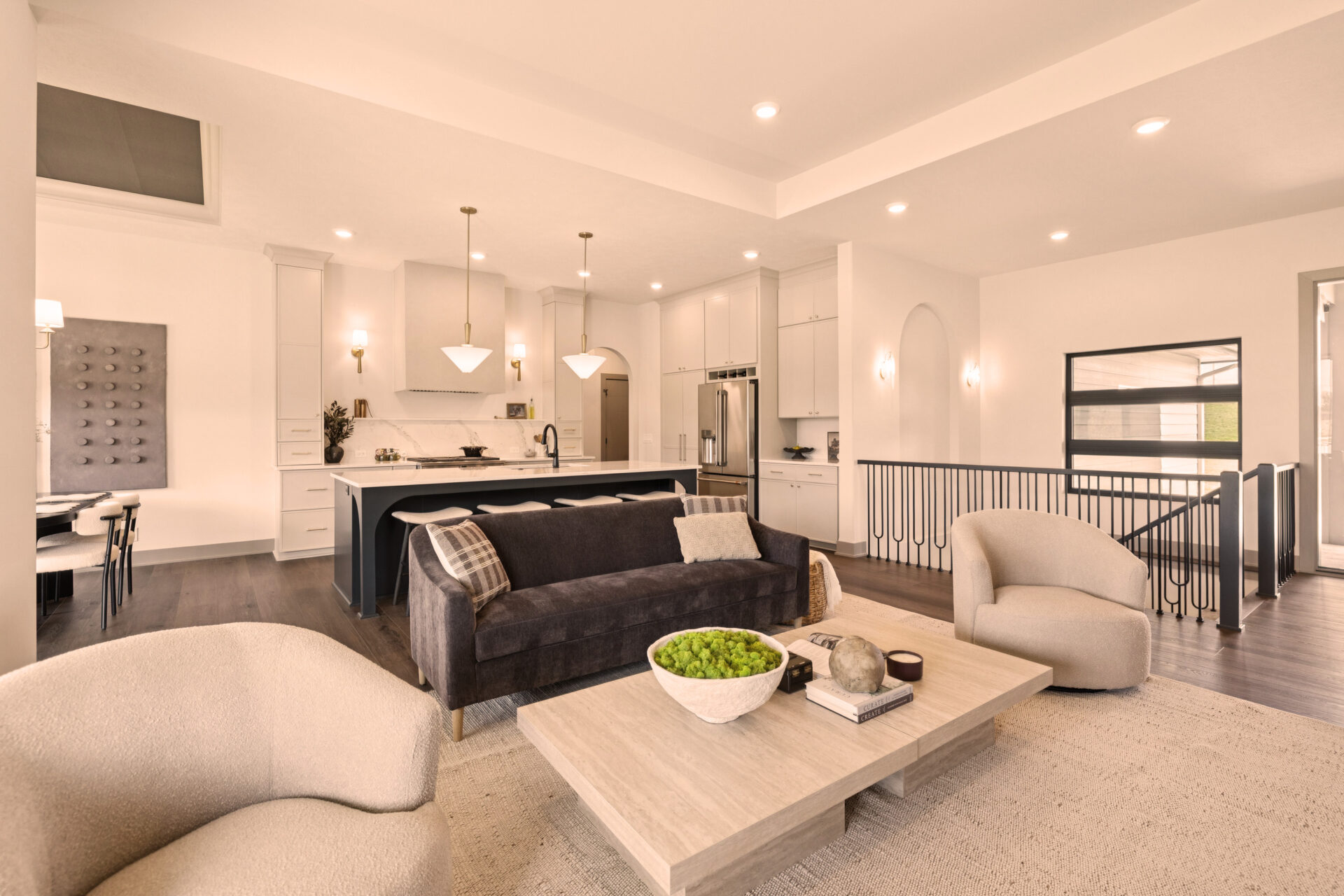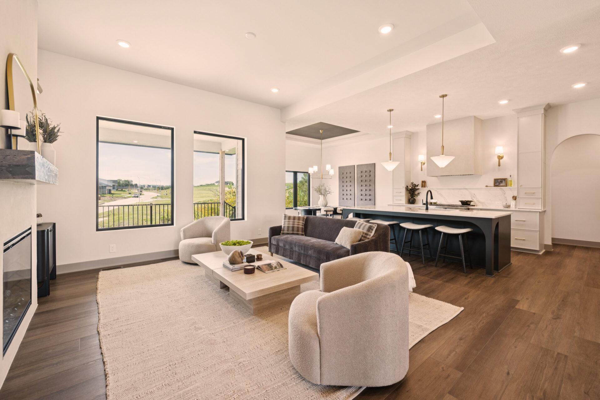 The heart of the home is its open-concept design, where the kitchen effortlessly flows into the living and dining areas. This layout promotes a sense of togetherness and ease of movement. The Eat-In Island Kitchen is perfect for casual meals or culinary adventures, and it opens up to the spacious main floor Gathering Room, creating an ideal space for both everyday living and festive gatherings.